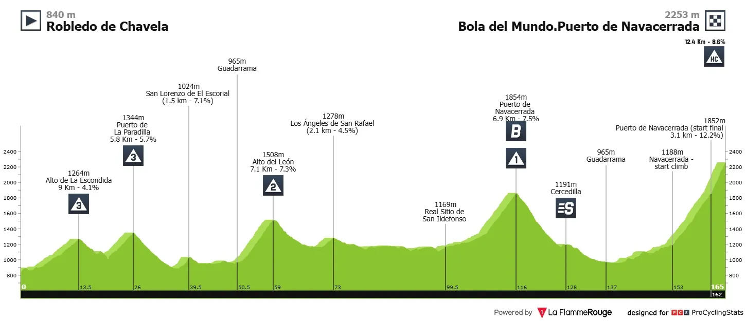 Este sábado se disputará la etapa ‘Reina’ de La Vuelta a España 2025. Serán 164.8 kilómetros de recorrido entre Robledo de Chavela y Bola del Mundo. Puerto de NavacerradaEl arduo día será con 5 puertos de montaña: 2 de tercera, 1 de segunda, 1 de primera y el restante es un gran puerto (HC) en la meta.