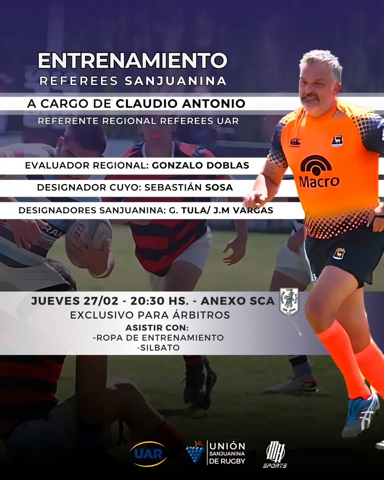 El evento se realizará este jueves 27/02 desde las 20.30hs en el Sporting Club Alfiles. Para esta cita en el club sanjuanino, el referente regional de la UAR pidió que los que asistan lo hagan con ropa de entrenamiento y silbato, para la segunda parte de la capacitación.
