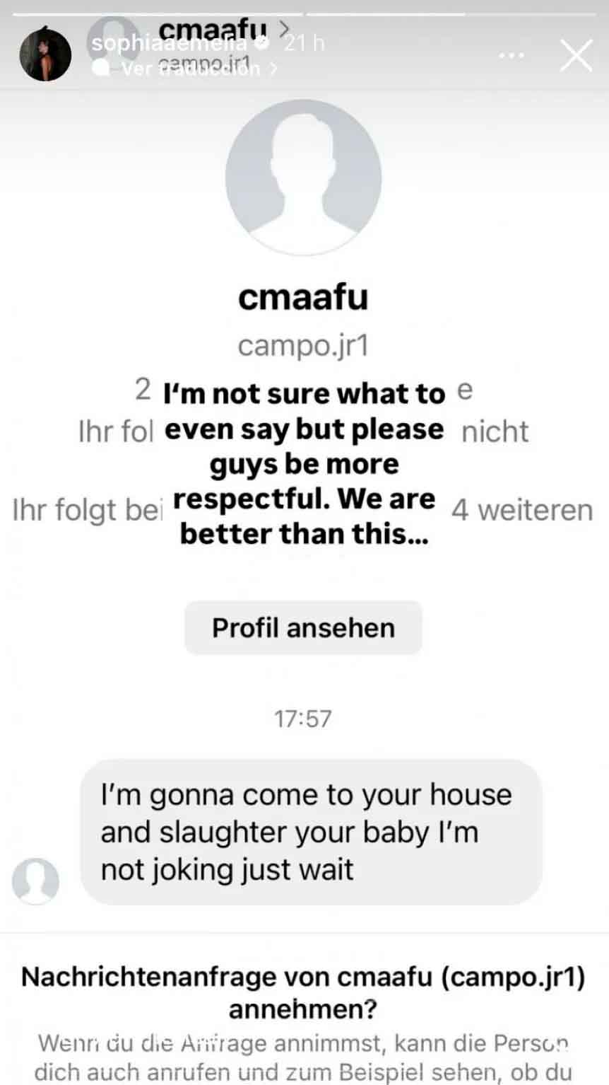 Sophia Havertz, que está embarazada del delantero alemán, publicó en sus historias de Instagram una serie de graves mensajes que le llegaron. «Espero que tengas un aborto» y «voy a ir a tu casa y asesinar a tu bebé. No estoy bromeando, solo esperá», le enviaron usuarios enojados por el rendimiento de su marido.